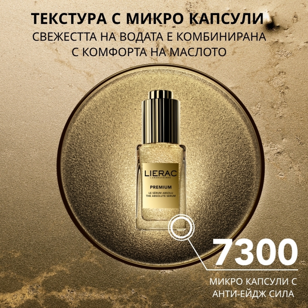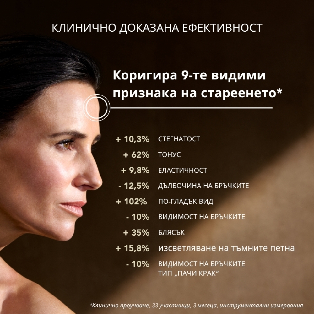 Съвършеният серум коригира всички признаци на стареене, изглажда кожата и засилва сиянието й. Обогатен с 96% съставки с естествен произход този серум е наситен с противостареещата сила на 7300 микрокапсули*. Формулата комбинира технологията [F.G.N.] с папаин и ниацинамид и е насочена към трите главни причини за стареенето на кожата. Абсолютният серум коригира всички признаци на стареене - бръчки, фини линии, тъмни петна, липса на стегнатост, сияние, еластичност, плътност и сухота.